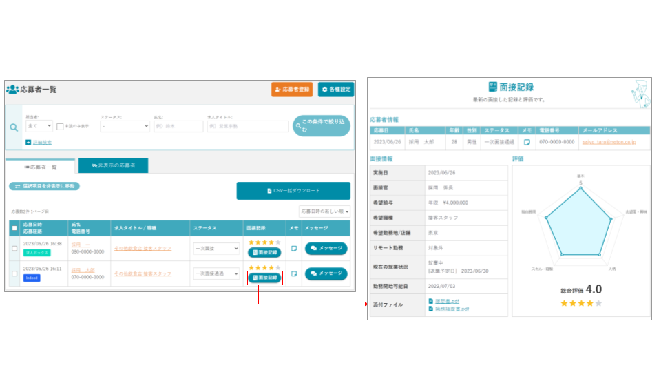 記録した情報は、応募者毎に簡単に確認することができます。
