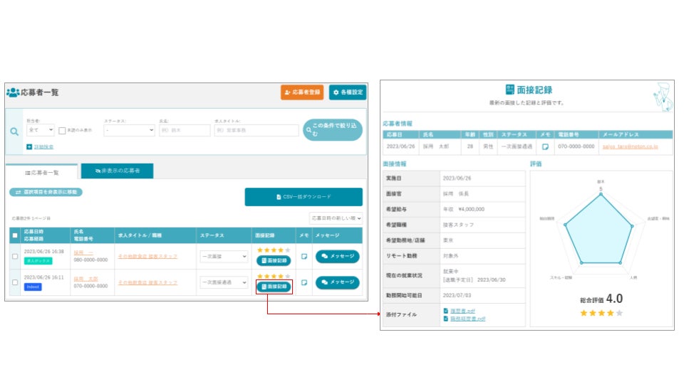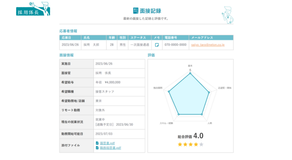 また、PDFや画像ファイルを添付することができ、履歴書等を一元管理することができます。