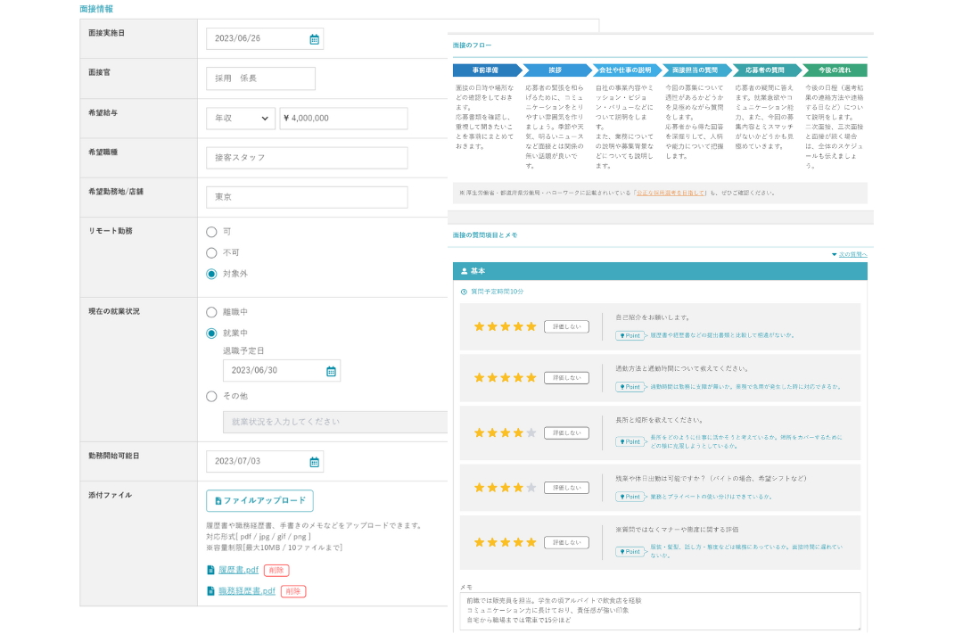 応募者の希望の勤務形態や勤務開始日など、面接に際しての基本的な情報を記録できます。