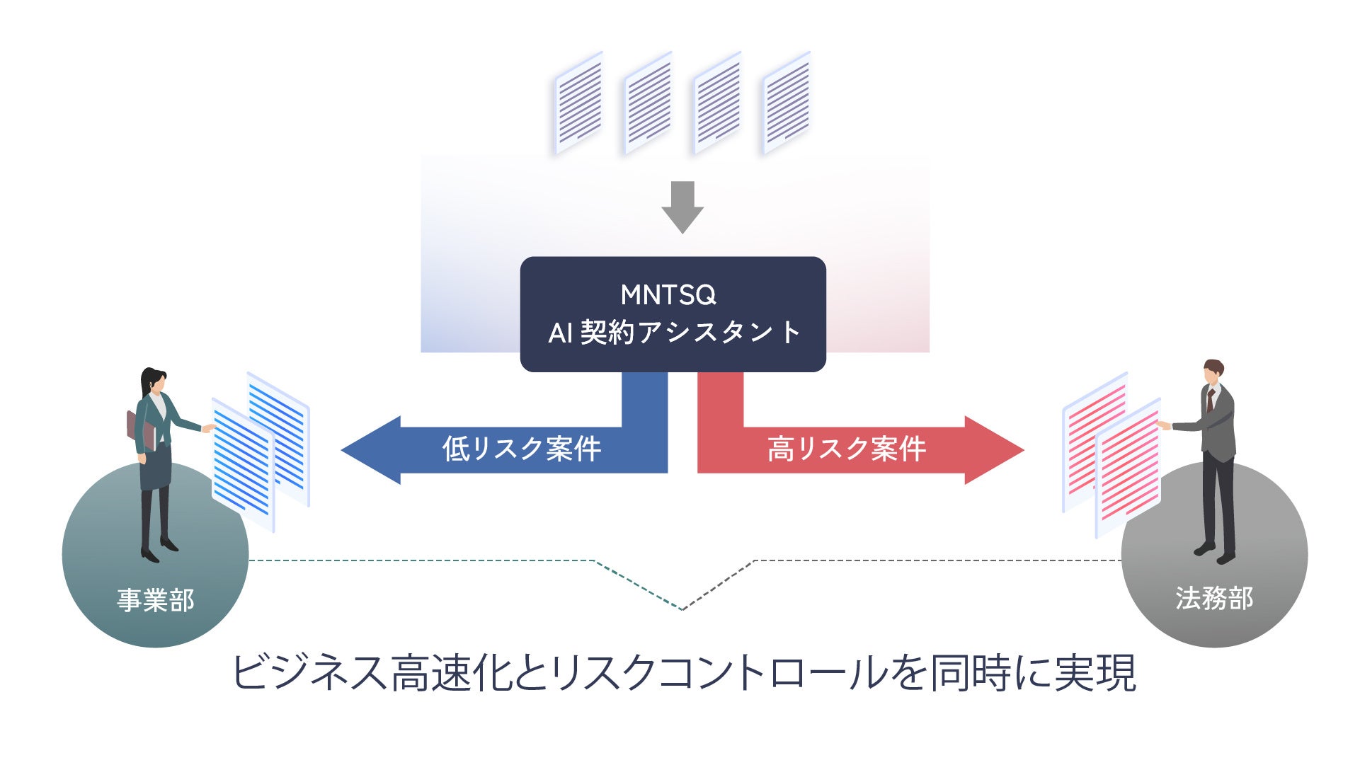 低リスク案件をユーザーが自律的に進められることでビジネスのスピードアップに貢献し、一方で高リスク案件はAIが必ず法務相談へつなげることでガバナンスも向上。同時に、法務部は本当に重要な案件の対応に集中することが可能になります。