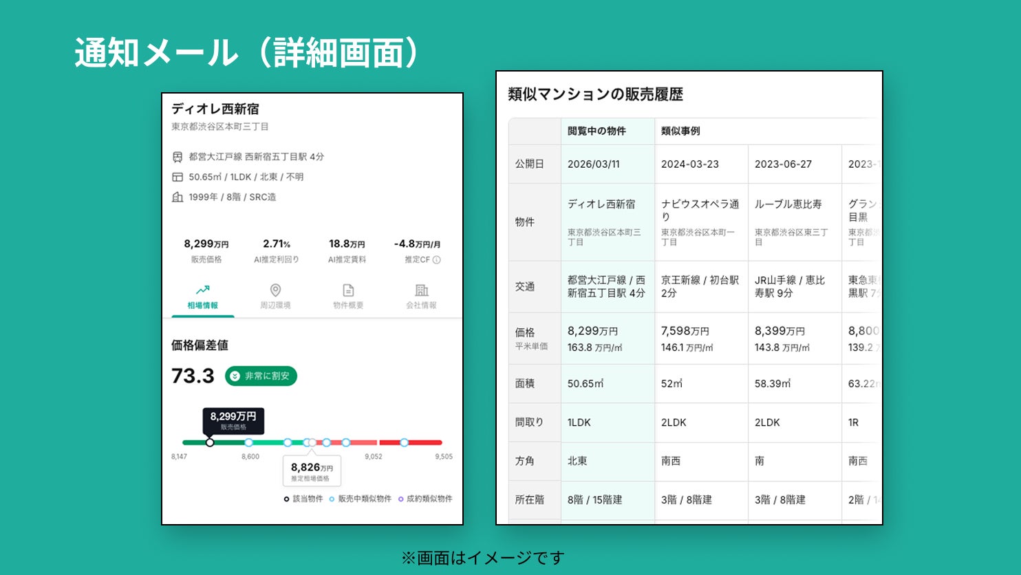 物件概要や価格だけでなく、類似事例や販売履歴など、判断材料となる情報をあわせて確認可能。