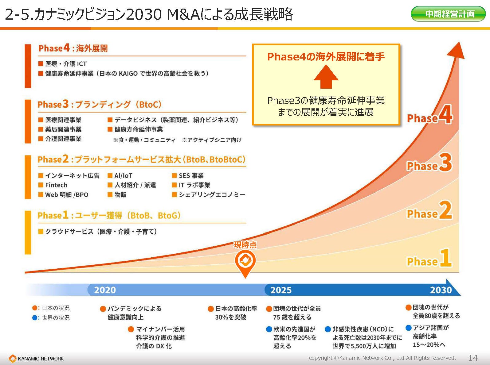 当社グループは、日本の課題に対するソリューションサービスを提供する企業として、①超高齢社会、②健康寿命延伸、➂スタートアップ支援を三本の柱にサービス品質・技術力の強化、顧客満足度の向上に継続的に努めておりますが、今後、更なる成長・発展を遂げるために、超高齢社会のヘルスケア分野と関連性の高い事業を推進し、新たな付加価値を創造していくことが必要であると認識しております。今後の成長戦略としましては、M&Aを積極的に推進し、ヘルスケア分野から保険サービス分野、リアル店舗からITサービスまで、事業ポートフォリオの拡大等を掲げております。