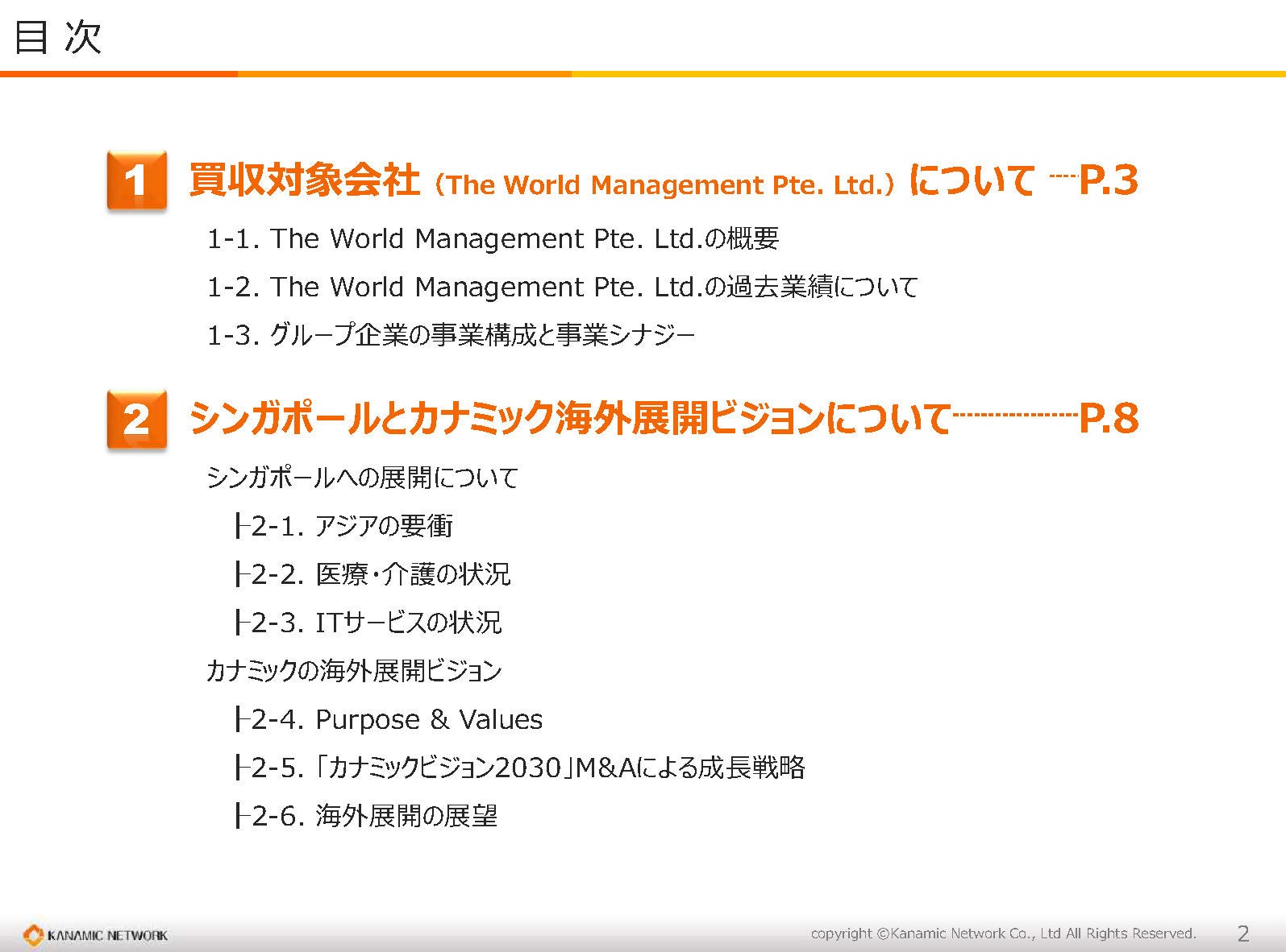 当社では『「人生を抱きしめるクラウド」で人と社会に貢献する』というビジョンを前提に「事業コンテンツ」、「事業エリア」、「事業ツール」の補強・拡大を行うため、M&Aを積極的に推進しており、TWM社の株式取得は、当社の成長戦略『カナミックビジョン2030』の「Phase4:海外展開」への本格的な着手ともなります。当社グループにおける新規事業の創出・既存事業の拡大とともに、M&Aの推進を通じてビジョンの実現と継続的な成長を図ってまいります。