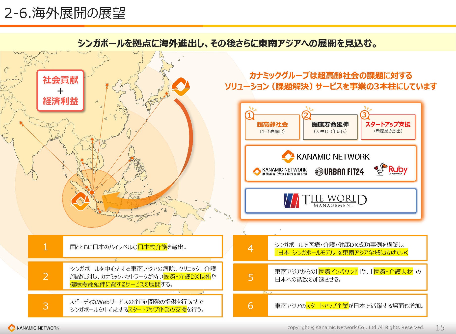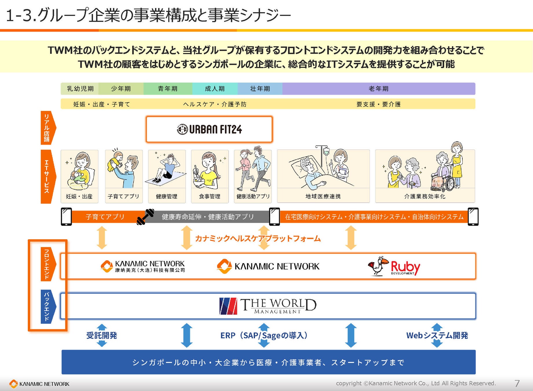 TWM社のバックエンドシステムと、当社グループが保有するフロントエンドシステムの開発力を組み合わせることで、TWM社の顧客をはじめとするシンガポールの企業に、総合的なITシステムを提供することが可能となります。また、TWM社の顧客のなかには、介護事業や医療クリニックを手掛けている企業も複数あり、TWM社の顧客群は、当社がヘルスケア・ヘルステック企業として更なる付加価値の高いサービスを提供する上で大きな推進力になると判断しております。またシンガポールを拠点にASEAN諸国をはじめとした東南アジアへの展開も見込んでおります。