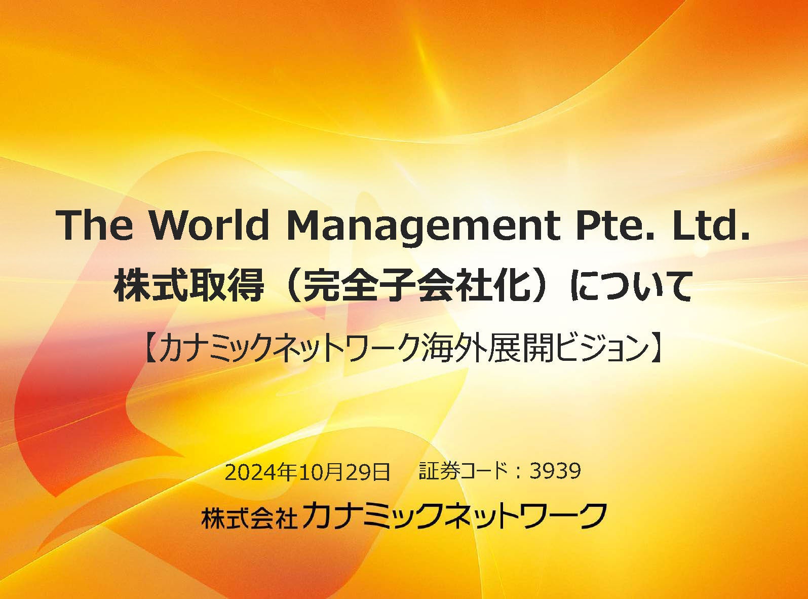 当社は、2024年10月29日開催の取締役会において、THE WORLD MANAGEMENT PTE LTD(以下、「TWM社」)の株式を取得し当社の連結子会社とするため、株式譲渡契約を締結することを決議しましたので、お知らせいたします。