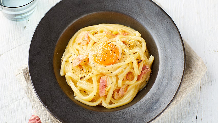 パスタより手軽で、もちもちうどんとだしの利いたとろとろ濃厚ソースが絶妙で、癖になるカルボナーラです!