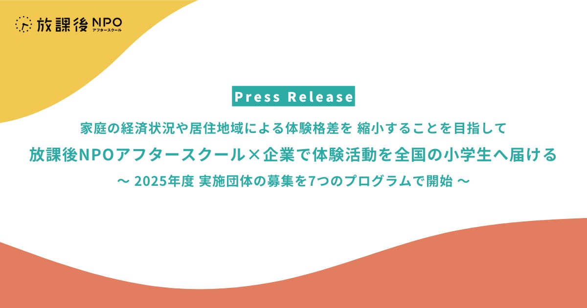 「日本中の放課後を、ゴールデンタイムに。」をミッションに活動する 特定非営利活動法人 放課後NPOアフタースクール(代表理事:平岩国泰、本部:東京都文京区/以下「放課後NPOアフタースクール」)は、家庭の経済状況や居住地域に関係なく、すべての子どもたちが体験機会を得られる社会を目指して活動を続ける中、2025年度もパートナー企業と協働して、日本全国の小学生の居場所に体験活動を届けます。7つの企業協働プログラムにおいて、実施団体の募集を行っています。