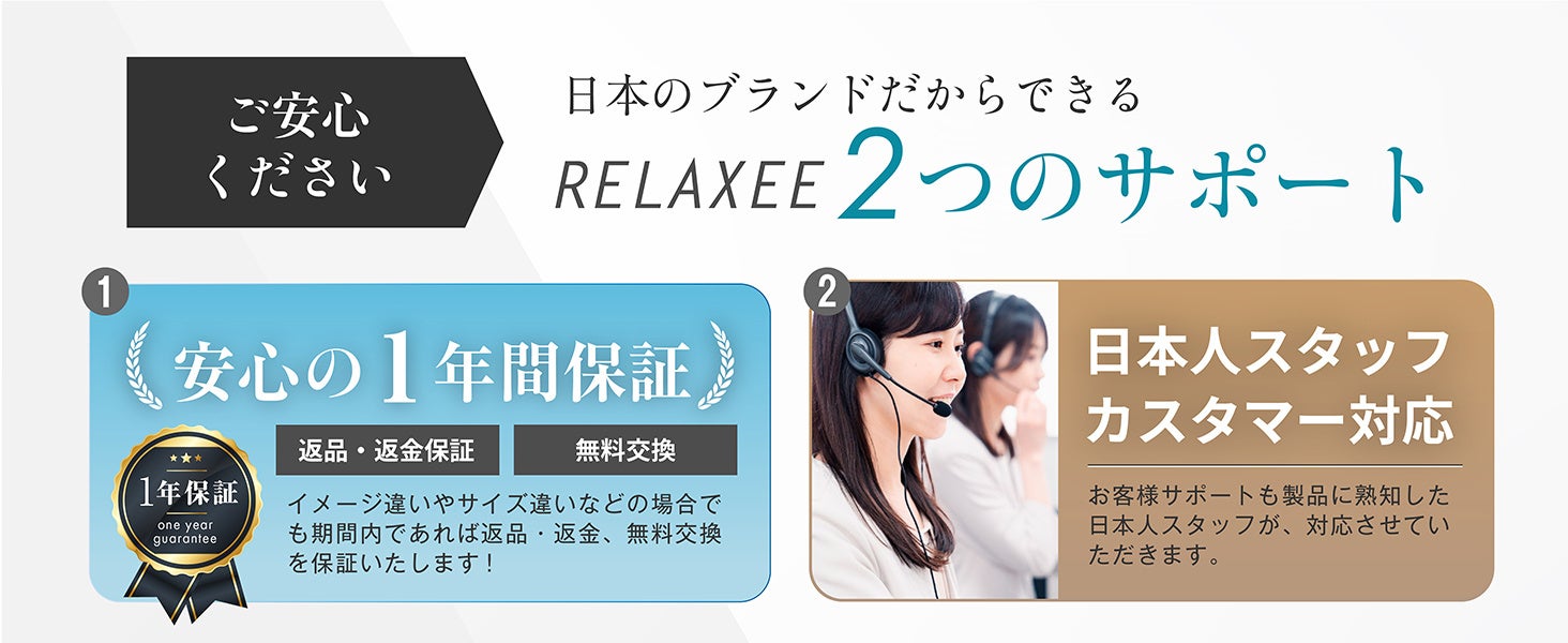 RELAXEEは日本のブランドであり、ISO 9001認証を取得した工場で製造されております。厳しい品質管理のもとに製造された本製品は、安心してご使用いただけます。また、1年間の長期保証が付いており、万が一のトラブル時にも迅速にサポートいたします。