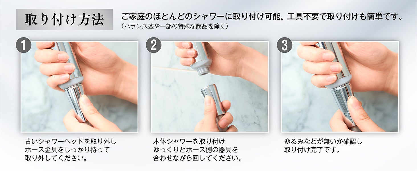 RELAXEEシャワーヘッドは、G1/2規格の標準シャワーヘッドに対応しており、4種類のアダプターが付属しているため、工具を使わず簡単に取り付けられます。自宅のシャワーに簡単に設置できるので、購入後すぐに使用可能です。