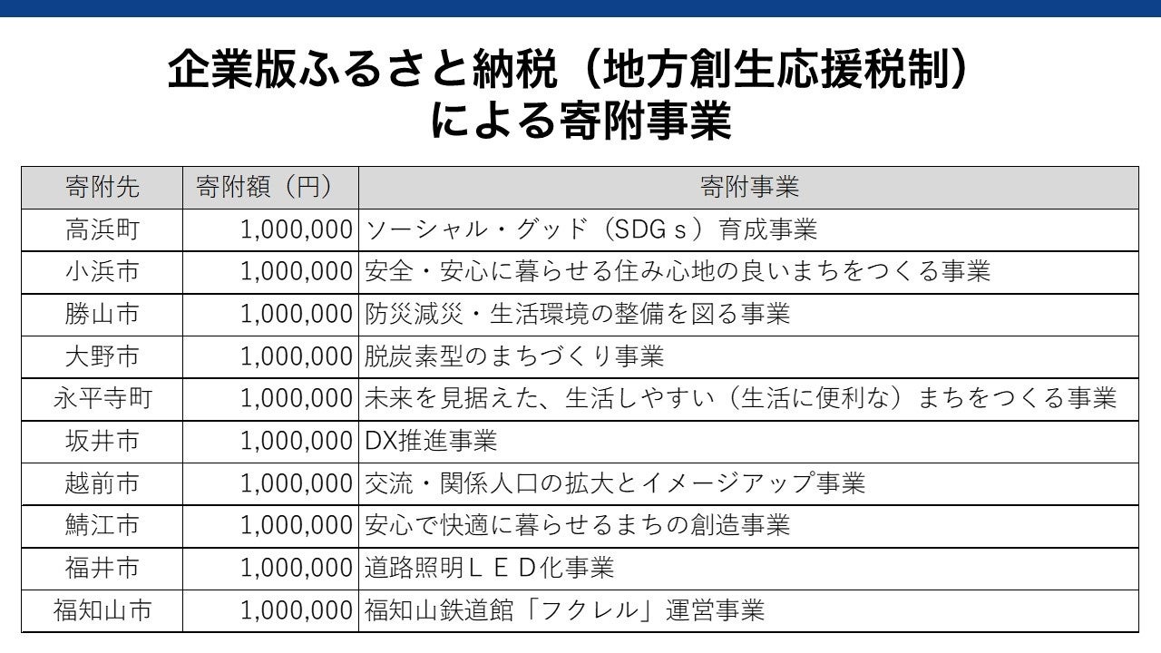 寄附先として10の自治体を選定した背景には、福井県(※)がSDGsへの取り組みに積極的であり、当社グループとして適切にサスティナビリティ活動を推進できると判断したためであります。