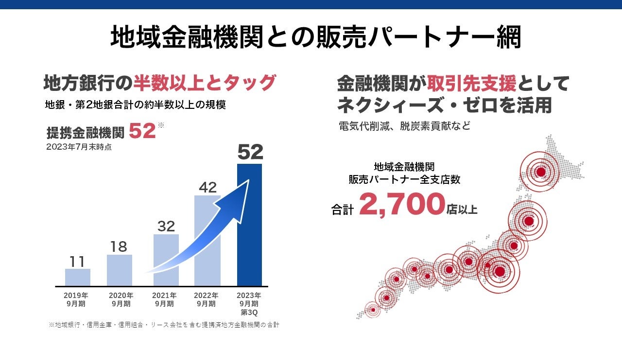 現在、当社グループは52行の地域金融機関とパートナー契約を締結しており、「誰ひとり取り残さない」SDGsの達成を目指して、「ネクシィーズ・ゼロ」の活用による省エネ設備の普及を推進しております。例えば、支店や営業所が無いエリアでも事業活動の状況を把握している金融機関が「ネクシィーズ・ゼロ」を紹介することで、効率的に普及させられるとともに、現地の電気工事事業者を最優先して施工発注を行うため、クライアントや地域の皆さまにも喜ばれております。
