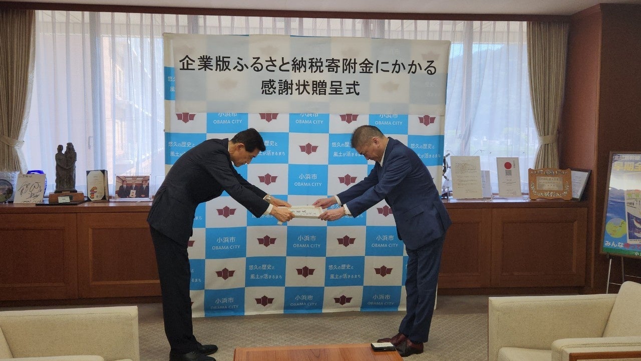 小浜市長より感謝状を受け取るネクシィーズグループ 取締役副社長 大前成平