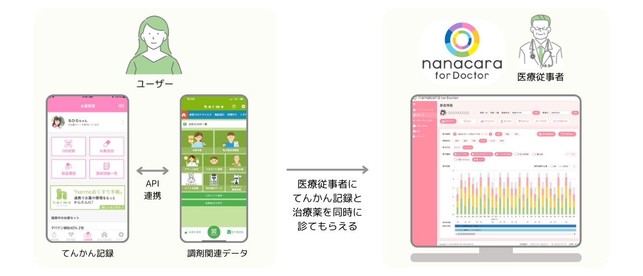 今回のAPI連携により、nanacaraの利用者はharmoおくすり手帳を通して調剤関連データを取り込むことが可能になりました。またharmo加盟薬局※2を利用すると、自動的に調剤関連データがnanacaraにも登録されるなど、手間の軽減につながります。