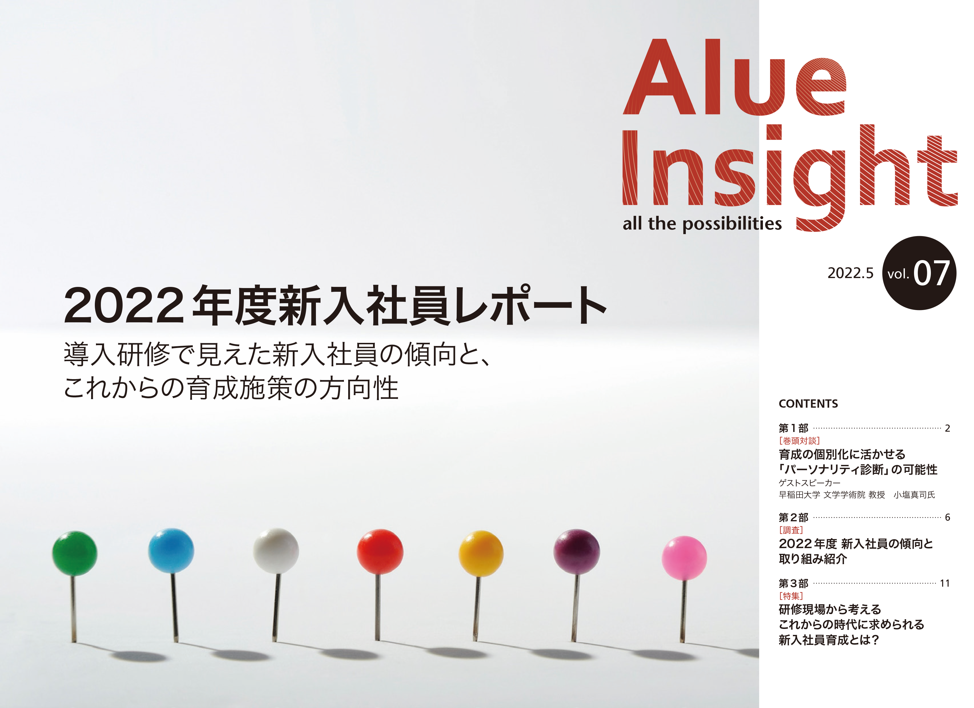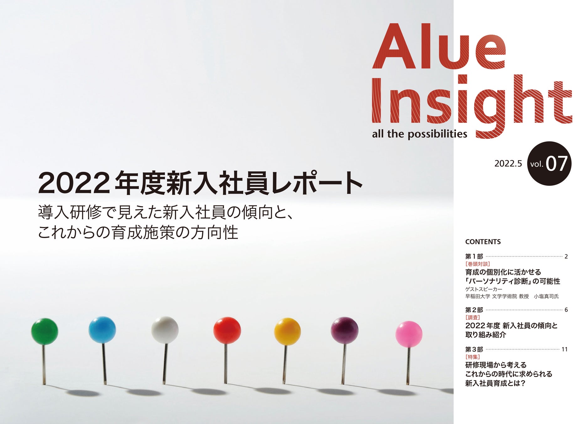 『Alue Insight』は、人材育成をテーマに、世の中のトレンドを取り上げる機関誌です。今号では、「導入研修で見えてきた2022年度新入社員の傾向とこれからの育成施策」をテーマとしました。