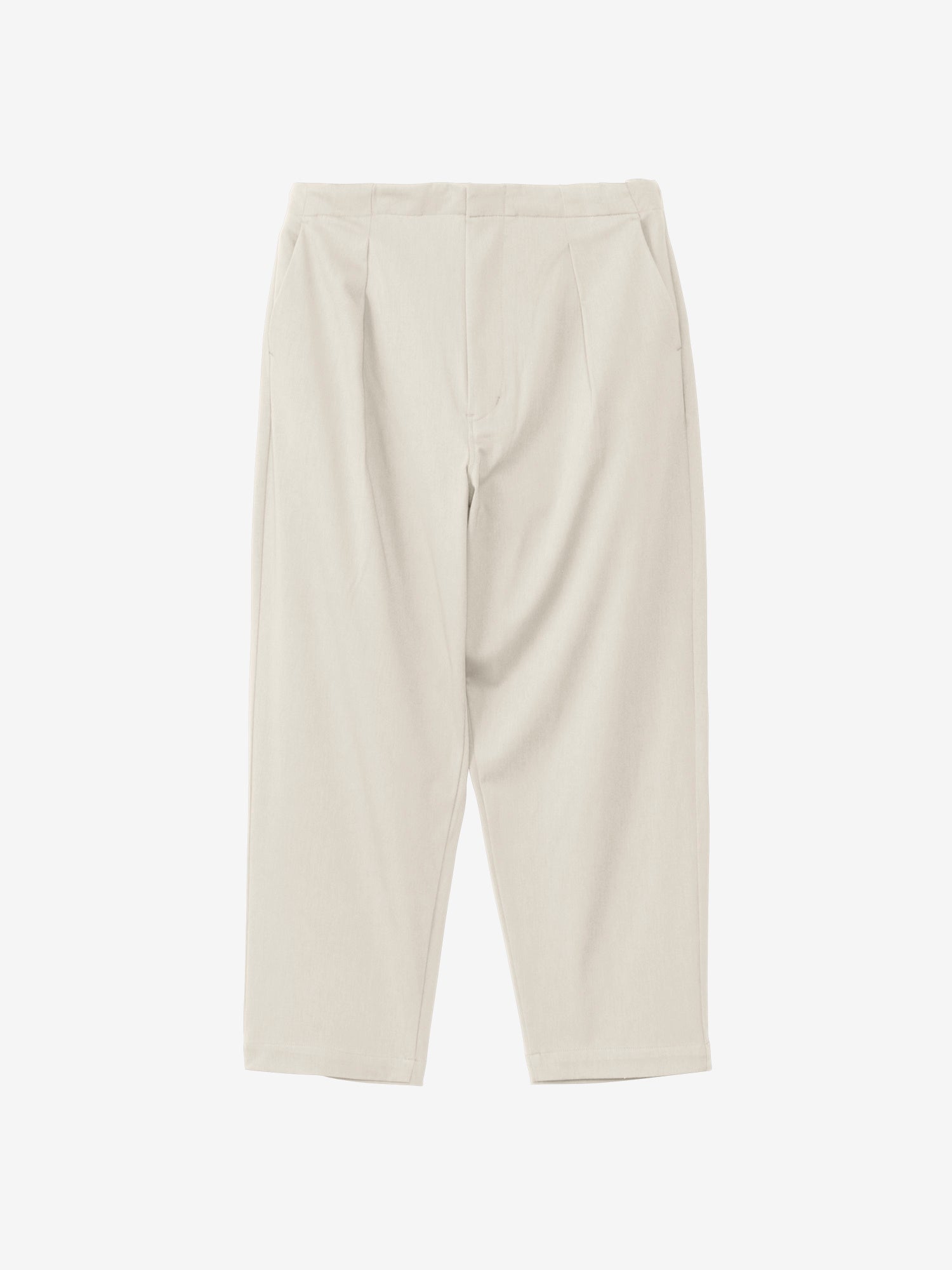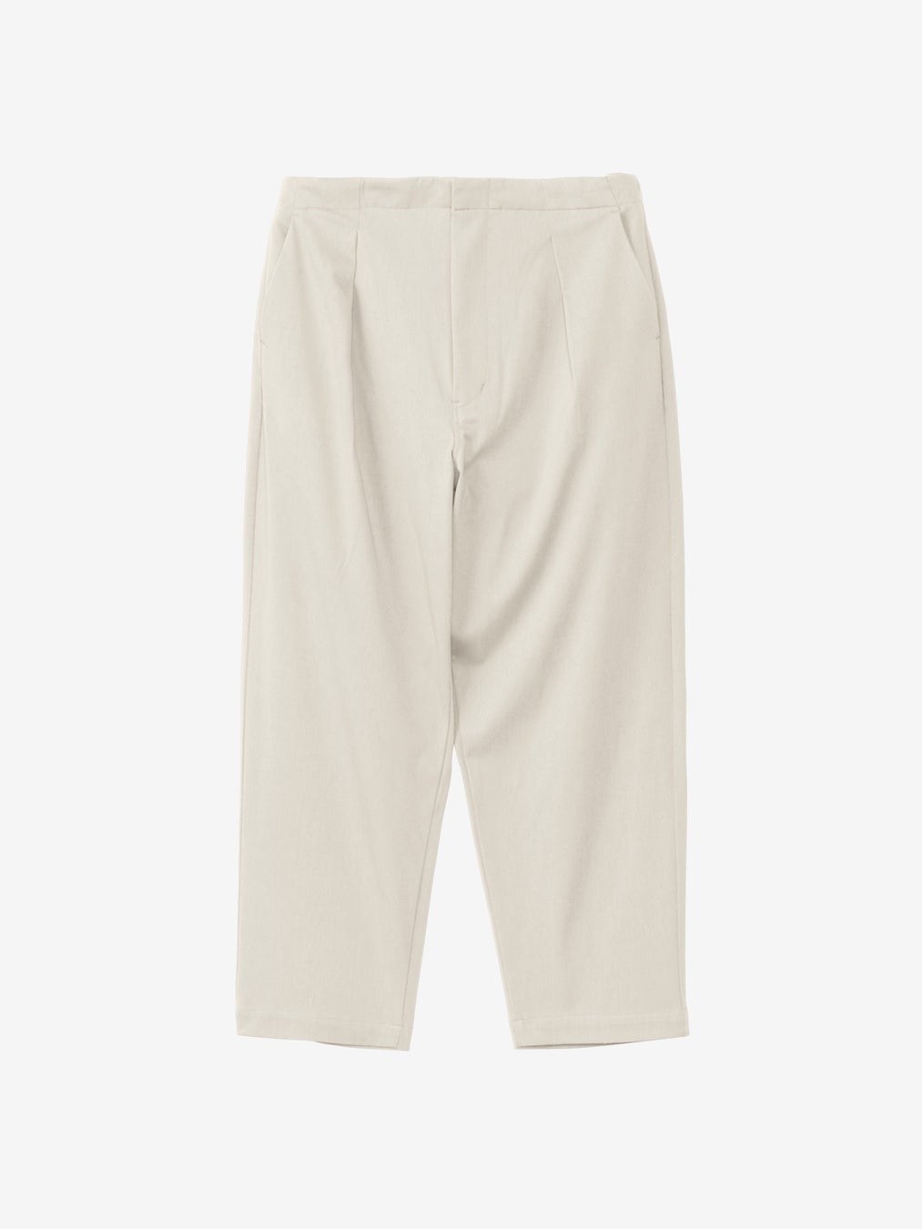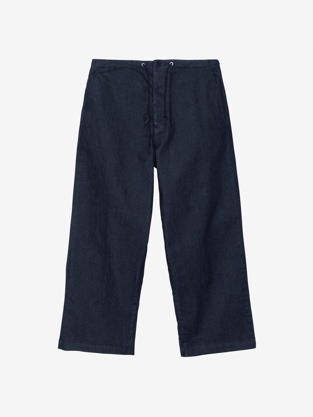 シルエットはゆとりのあるワイドストレートに仕上げることで、暑い季節でも快適に着用出来ます。ウエストはリラックス感のある紐タイプで、前開き部分はボタンフライ仕様です。