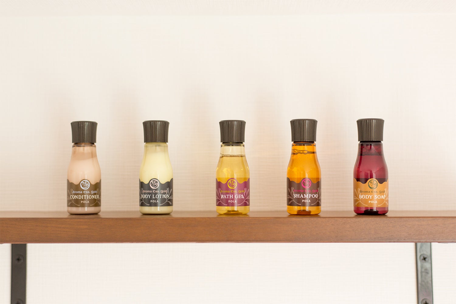バスタオル・フェイスタオル・バスマット・ボディソープ・シャンプー・コンディショナー・フェイス&ハンドソープ・歯ブラシセット・ヘアドライヤー・ヘアブラシ・レディースセット(ヘアゴム、コットン、綿棒)・カミソリ・ハンガー・スリッパ・緑茶、コーヒーセット