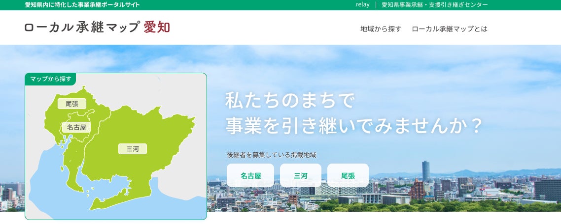 それに伴い、愛知県内に特化した事業承継ポータルサイト「ローカル承継マップ愛知(URL:https://relay.town/local-succession-map/aichi/)」を公開しました。