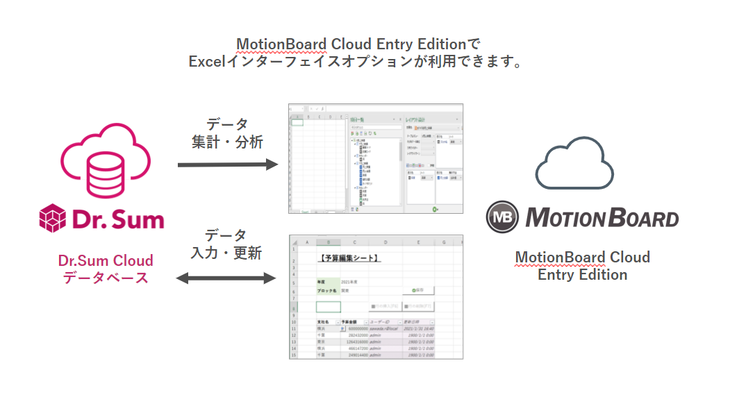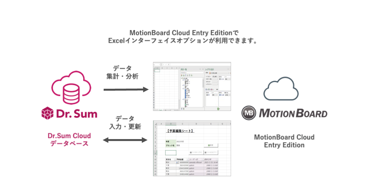 「MotionBoard Cloud」Entry Editionは、集計表に特化したWebインターフェイスで、利用者は直感的な操作でデータの分析をはじめることができます。今回のExcelインターフェイスオプションの提供により、ダッシュダッシュボード上に表示されたデータを使い慣れたExcelで深堀りすることや、Excelからのデータ入力・更新が可能となります。また、データ分析基盤「Dr.Sum」オンプレミス版をご利用いただいているユーザーのクラウドサービスへの移行時にWeb、Excelのインターフェイスを継続して利用できます。