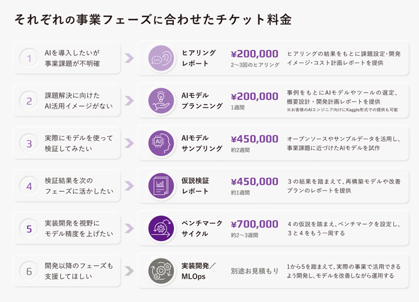 AIやデータサイエンスを導入するためのフェーズを6段階に分けてチケット化することで、事業に必要なAI機能の開発を必要な分だけ導入いただけるサービスです。