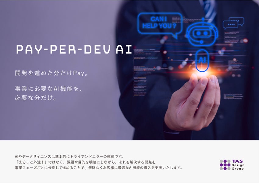 タスデザイングループでは、顧客のDX推進に向けたデータ活用・システム開発を行っており、その一環としてAI・データサイエンス導入支援「Pay-Per-Dev AI」を展開しています。