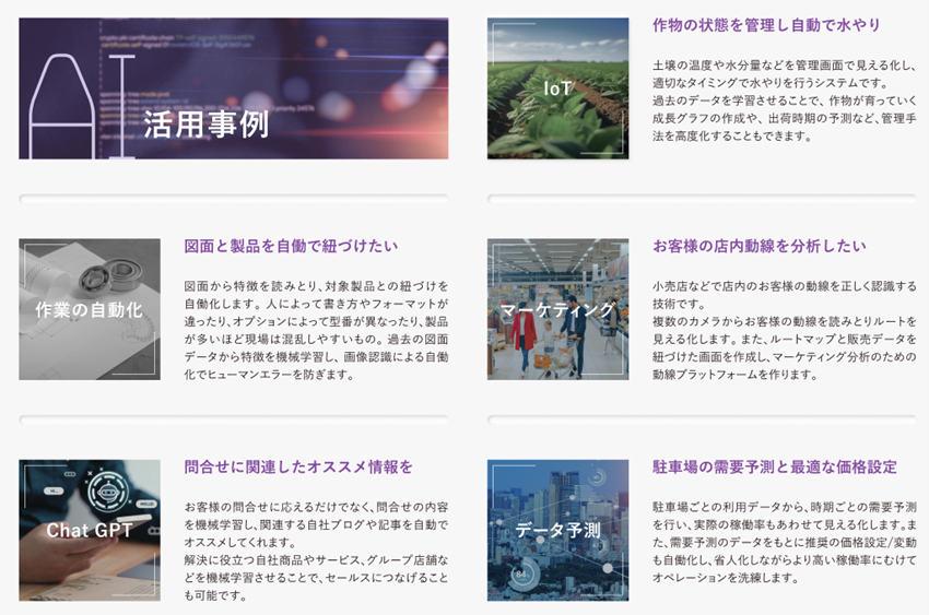 「構想はあるが、AIを導入する効果があるのか分からない」「どのようにAIを導入したらよいかわからない」「独自のAIシステムを構築したい」など様々な要望に応じるために、