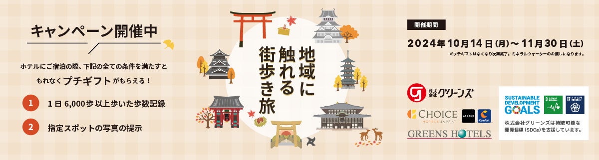 株式会社グリーンズ(本社:三重県四日市市、代表取締役社長:村木雄哉、証券コード:6547)は、スポーツの日にちなみ、2024年10月14日(月)から11月30日(土)までの期間、全国で運営する64ホテルにて、「街歩き旅」キャンペーンを開始しました。本キャンペーンを通じて、当社のホテルをご利用いただくお客様が、旅行や出張の滞在先で、アクティブに「街歩き」を楽しみながら健康的な生活習慣を身につけていただくことを推奨し、お客様に新しい習慣として取り入れていただくことを目的としています。