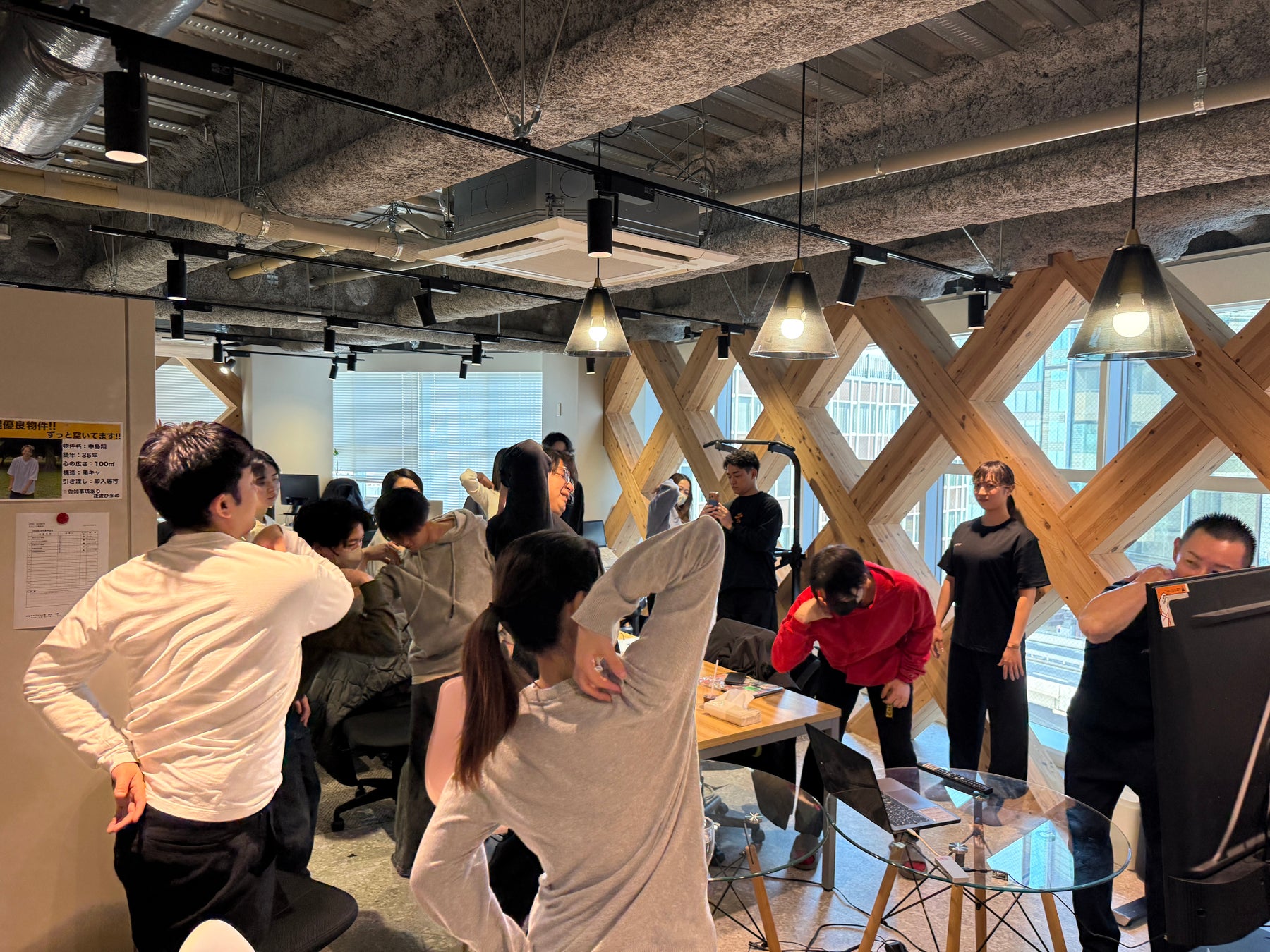 当日は対面とオンラインを組み合わせた形式で開催され、約20名の社員が参加。セミナーでは、デスクワークによる身体の不調がどのように起こるのかを解説したうえで、実際に体を動かしながらコンディションを整える簡単なワークを体験していただきました。