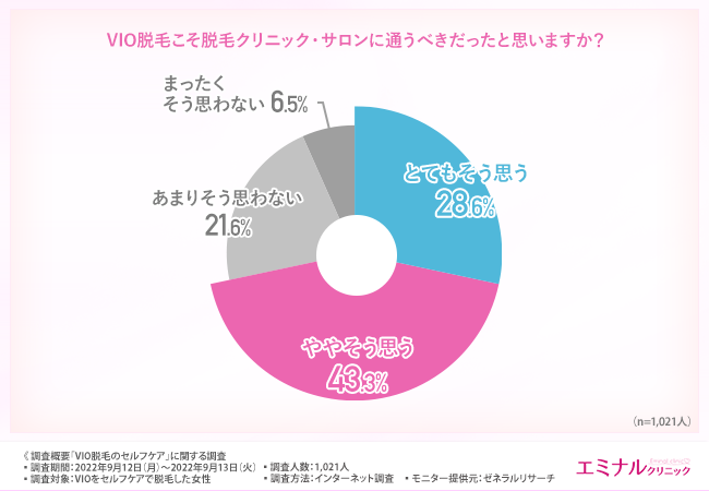 「VIO脱毛こそ脱毛クリニック・サロンに通うべきだったと思いますか?」と質問したところ、7割以上の方が『とてもそう思う(28.6%)』『ややそう思う(43.3%)』と回答しました。