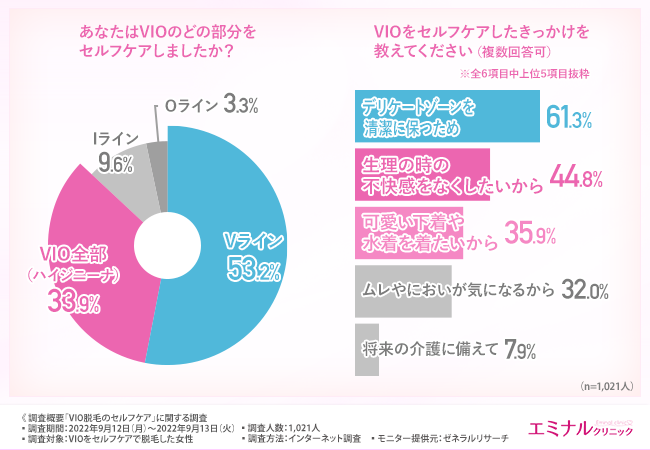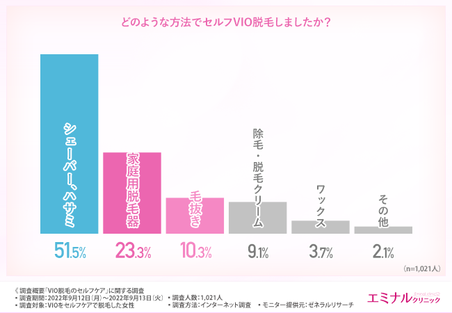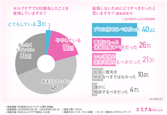 そこで今回、医療脱毛のエミナルクリニック(https://eminal-clinic.jp/lp01/?refmedia=11073)は、過去にVIOをセルフケアで脱毛した女性を対象に、「VIO脱毛のセルフケア」に関する調査を実施しました。