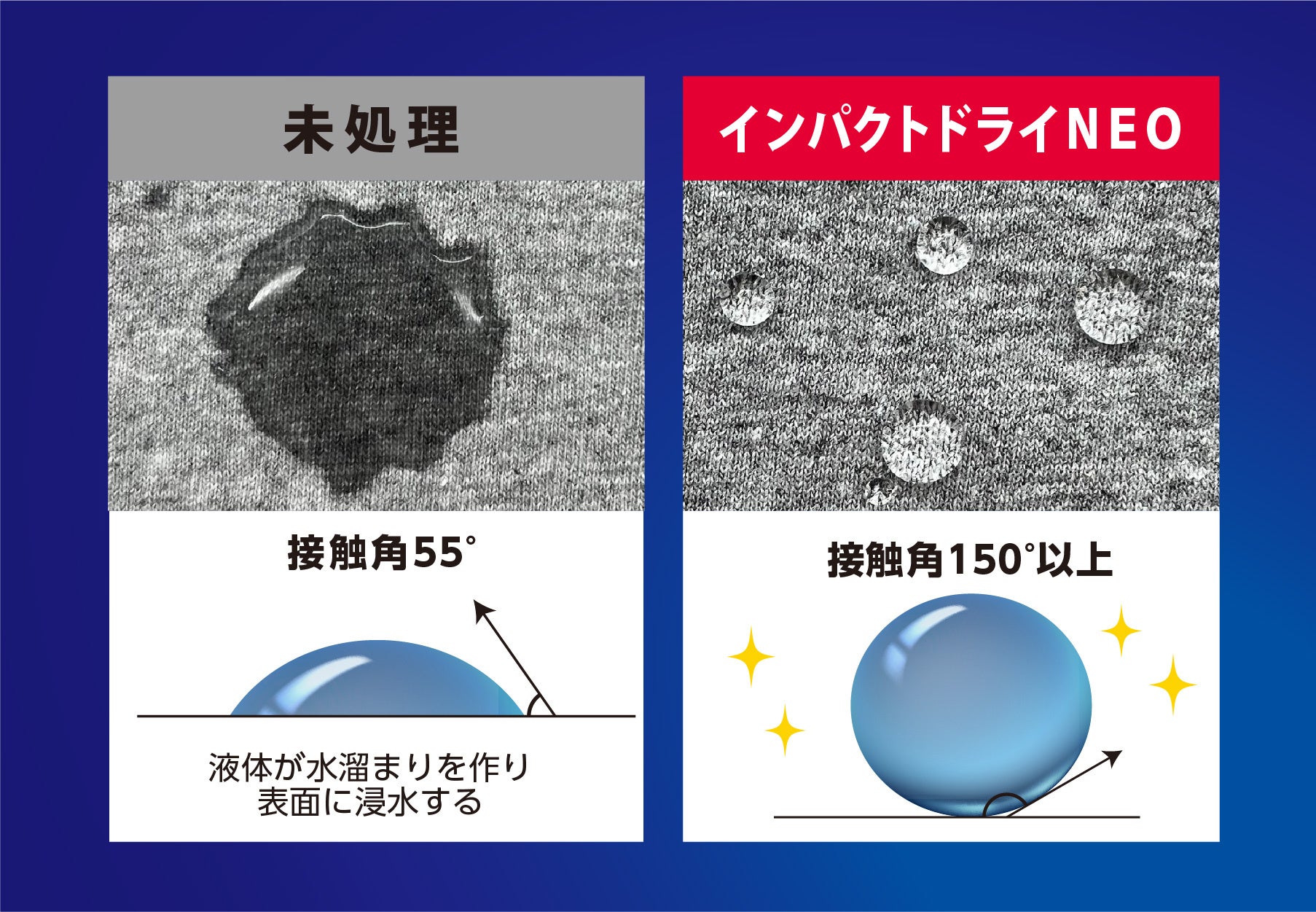 インパクトドライNEOは接触角150度の撥水力で、雨などの水滴が球体に近い状態で表面を転げ落ちていきます。