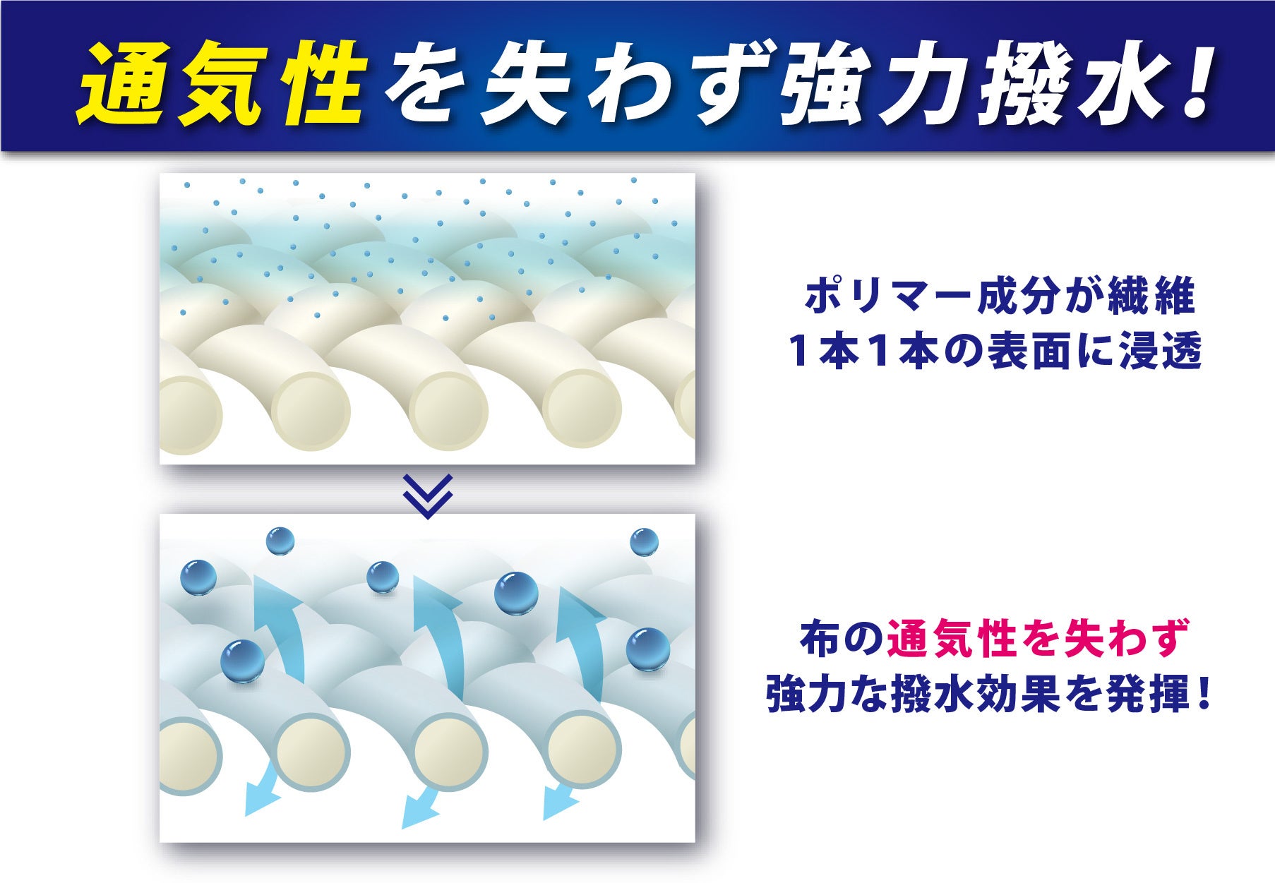 表面を覆うようにコーティングするス防水スプレーと違い、通気性を損なうことなく快適にお過ごしいただけます。