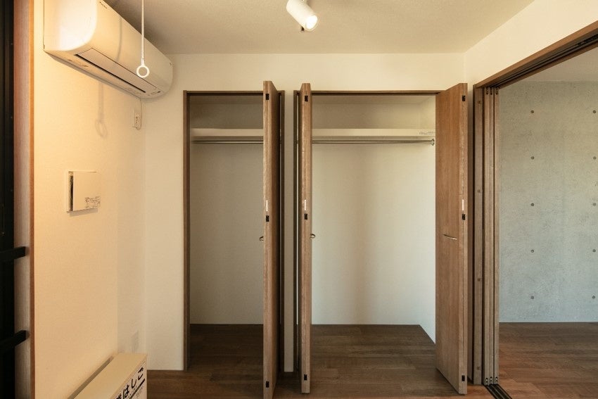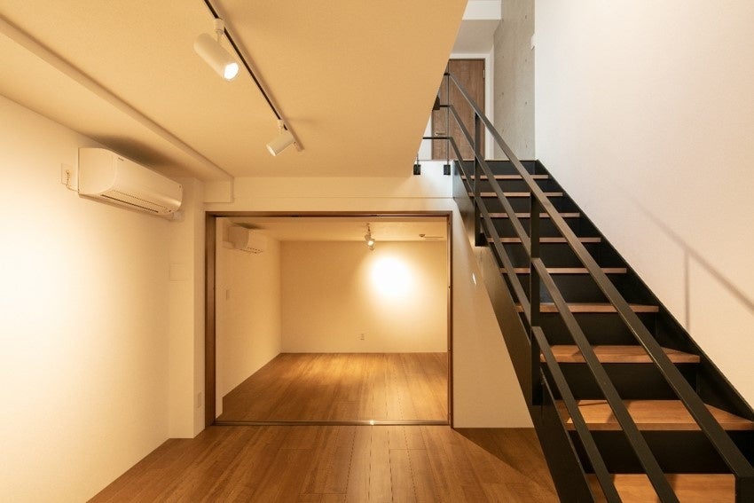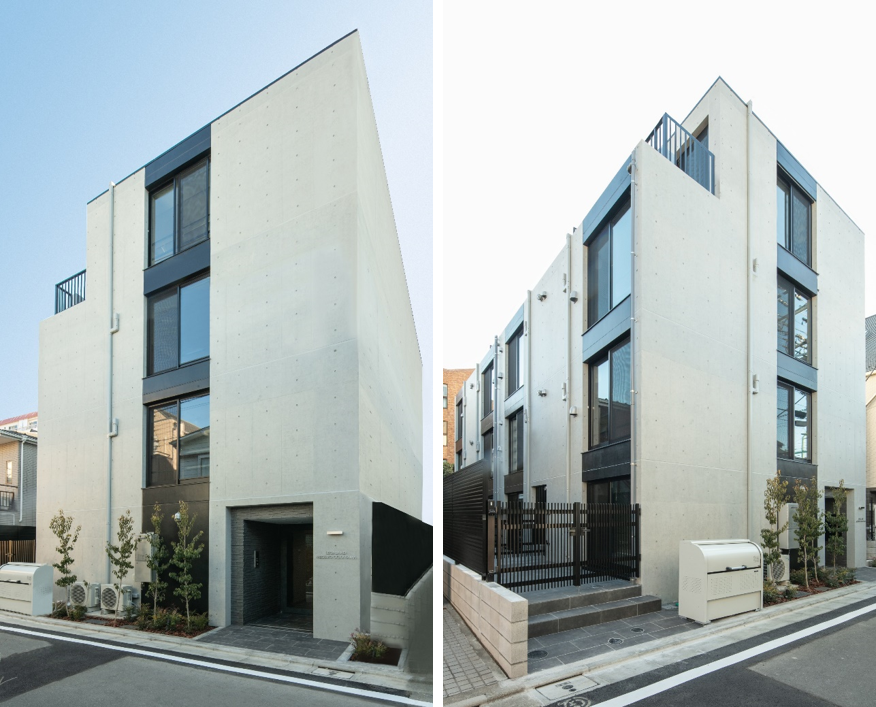 周辺に大学が多数あり、街全体は活気のあふれる明るい印象を受けます。その中で当物件は閑静な住宅街に位置しています。建物は、外部から視認性の高い面にコンクリートの打ち放しを用い、黒色の吹付で仕上げました。内装は、スタイリッシュな外観に合わせて玄関ドアやサッシの色をブラック系とし統一感を出しています。