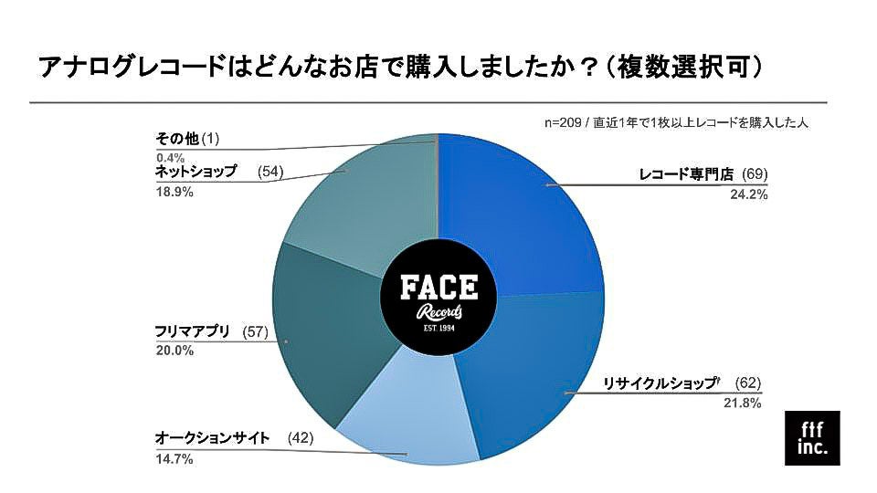 さらに、購入チャネルの多様化や、Face Records が展開する全国的な販売ネットワークの利用状況から、レコードカルチャーは従来の店舗販売に加え、ECや二次流通など多層的な市場に支えられていることも確認されました。