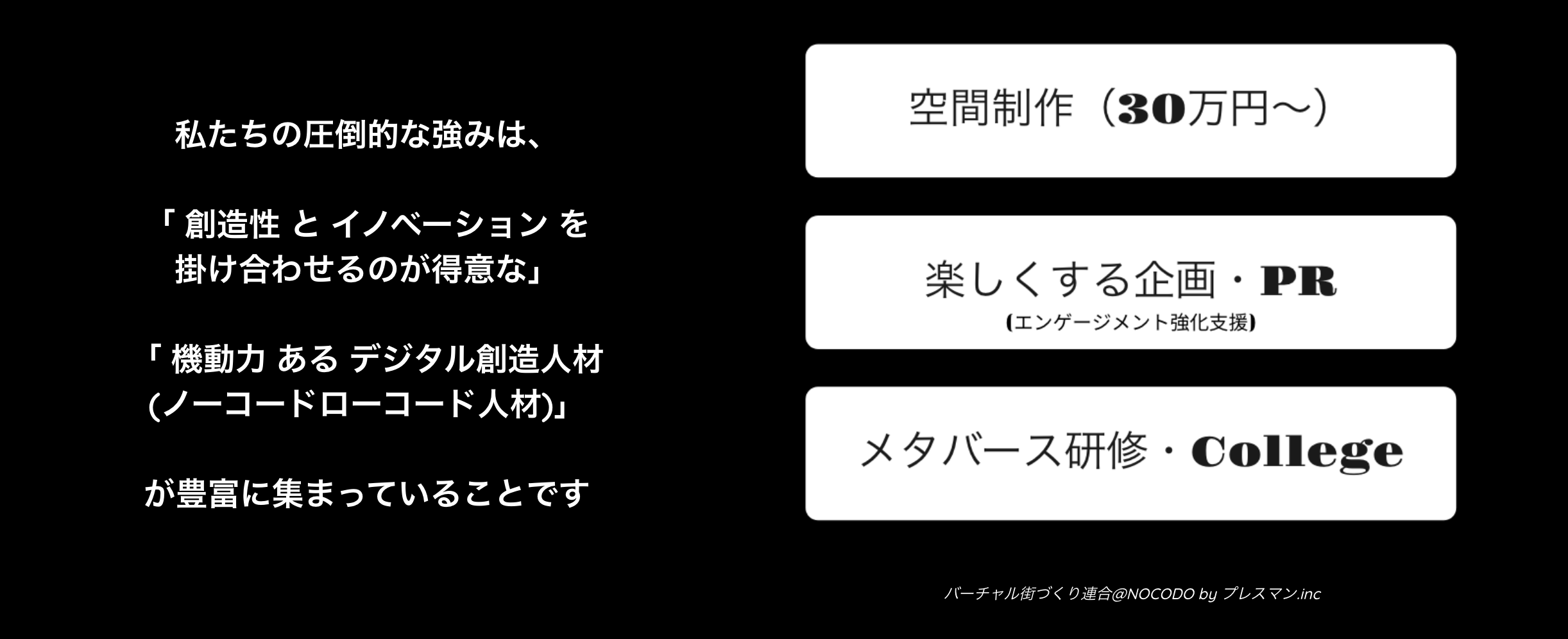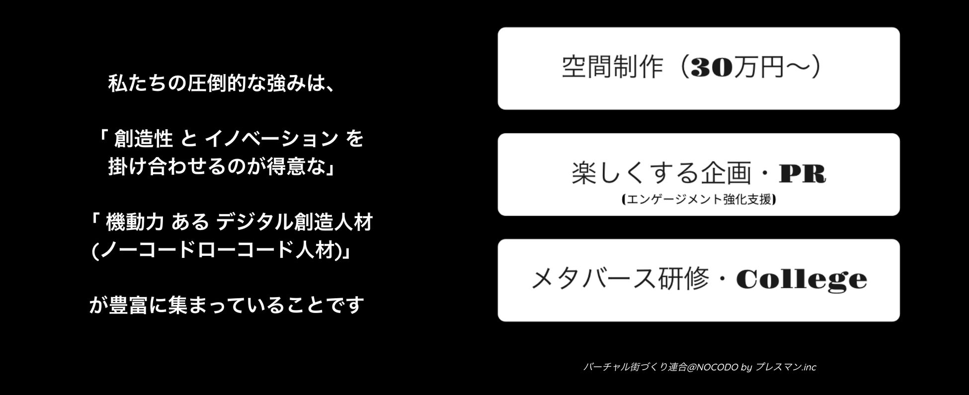 ※ノーコード/AIを組み合わせる思考と技術による現場、組織の持続成長を見据えた自走内製化支援サービスを展開する当社では、EC領域、業務、mvp開発領域に続き、Robloxを活用した地域や企業の空間DX領域への新たな営業展開を取り組みを約2年の実績蓄積期間を経て開始します。