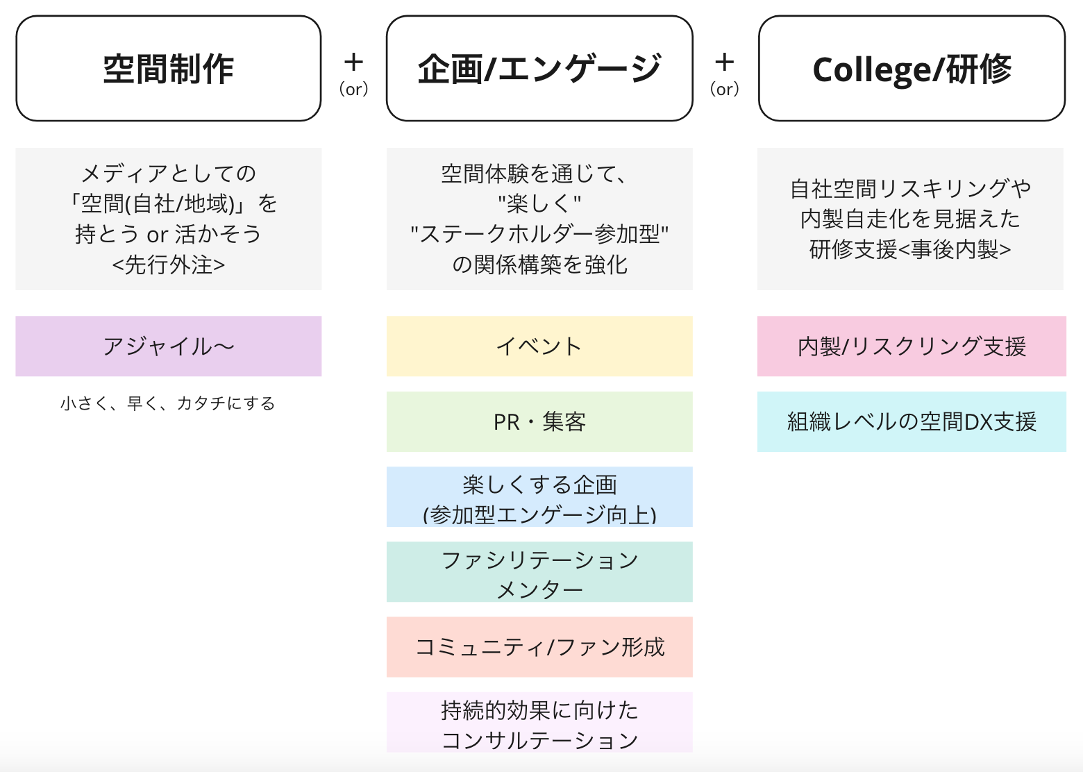 ✅ 空間制作を行うことも可能ですが、単にそれだけでなく、「創造性」と「イノベーション」を合わせたステークホルダー参加型のエンゲージメントを高める企画が可能です。
