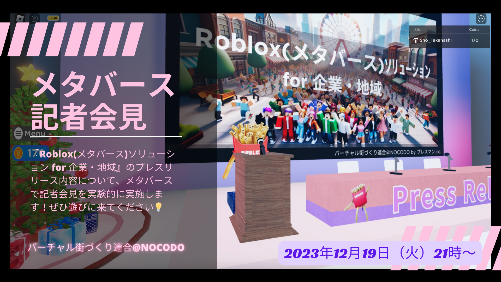 ①:Robloxでアバターで参加(メタバースのプレスリリース会場へお越しいただきます)