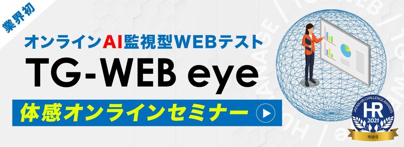 新型コロナウイルスの影響で、選考のオンライン化が一気に進み、応募者の不正行為を心配される採用担当者様は増加傾向にあります*1。オンライン選考時代、『TG-WEB eye』は、正直者が損をしない、ニューノーマルな採用試験として「日本HRチャレンジ大賞《奨励賞》」受賞のほか、ニュース番組で取りあげられるなど注目されています。