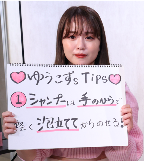 | ゆうこすさんヘアケアTips ①シャンプーは手のひらで軽く泡立ててからのせる ②トリートメントは毛先を中心に塗ってもみこみ5分おき、乳化させて流す ➂アウトバストリートメントを塗る前にくしでとき、揉み込むように塗る |