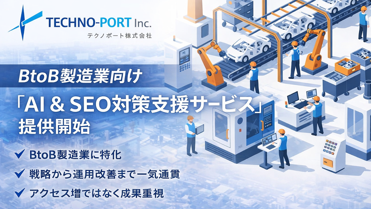 BtoB製造業のWebマーケティング支援を手がけるテクノポート株式会社(本社:東京都港区、代表取締役:徳山 正康)は、生成AIによる検索(ChatGPT、Gemini等)と従来の検索エンジン(Google等)の双方からの流入最大化を目的とした「AI & SEO対策支援サービス」を、製造業向けに提供開始したことをお知らせします。