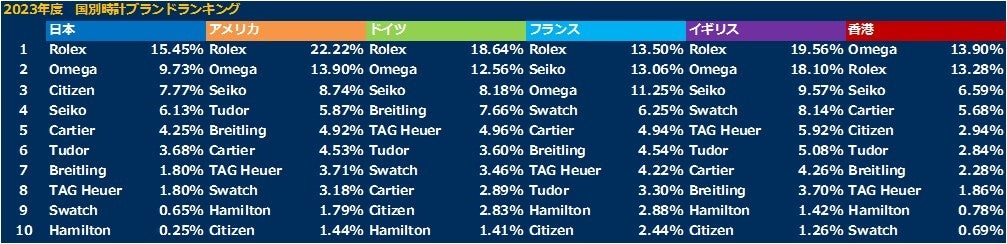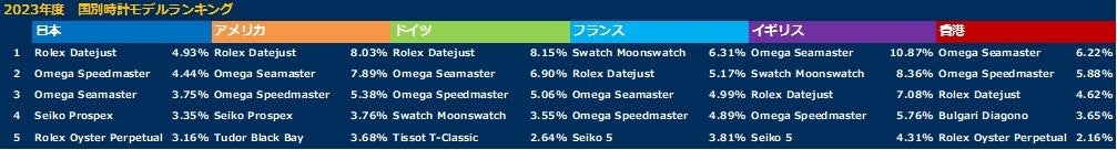 国別に見ていくと、多くの国で1位、2位にRolex、Omegaがランクインしています。全体的にSeikoの人気が高まっており、ドイツ、イギリス、香港、日本でシェアを伸ばし、フランスではシェア13.06%と、Rolexの13.5%に追いつく勢いで2位にランクインしました。また、Swatchについては、日本、香港では2022年に比べシェアを落としたものの、アメリカ、ドイツ、イギリス、フランスでは2022年以上に上昇し、引き続き注目を集めていることが分かります。