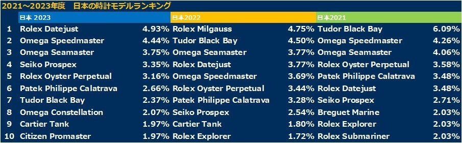 世界ではSeamasterが1位でしたが、日本ではDatejustがシェアを上げ、トップにランクインする結果に。また、グローバルのランキングにはランクインしなかったPatek Philippe Calatrava(パテックフィリップ カラトラバ)などのモデルが、日本では例年ランクインしています。