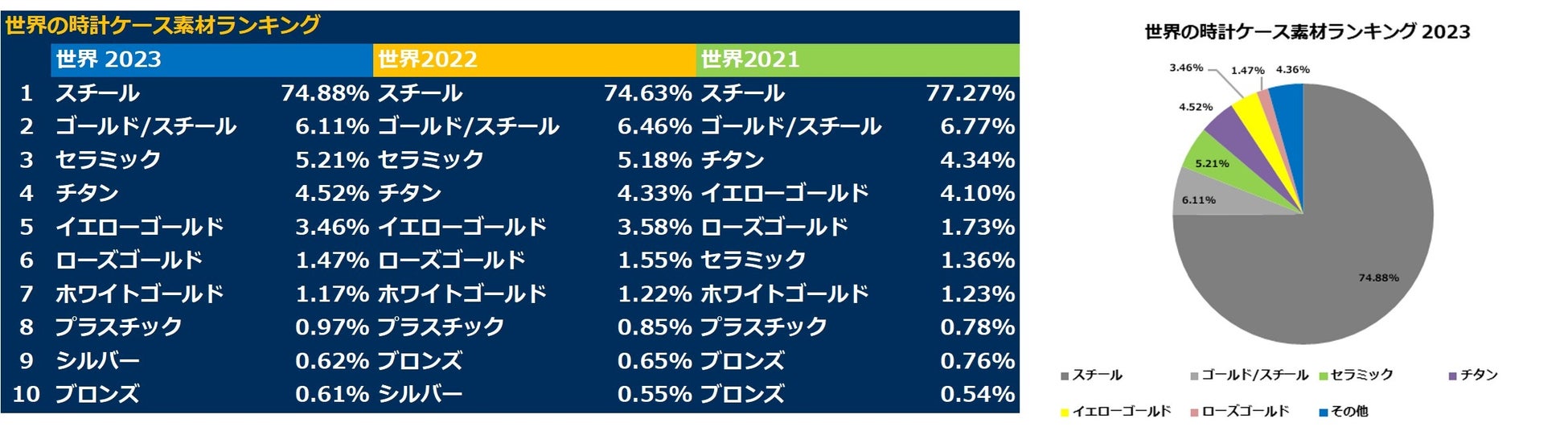ケース素材は1位のスチール素材が74.88%と、圧倒的なシェアを占めました。例年同様、スチールとコンビ(ゴールド+スチール)が1、2位を占める一方で、2021年には6位だったセラミックが順位を上げ昨年から3位にランクイン。