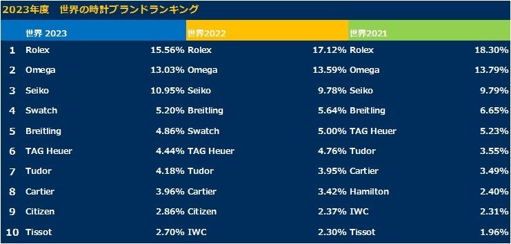 【世界時計ブランドランキング】Rolexがシェアを落としながらも1位に。