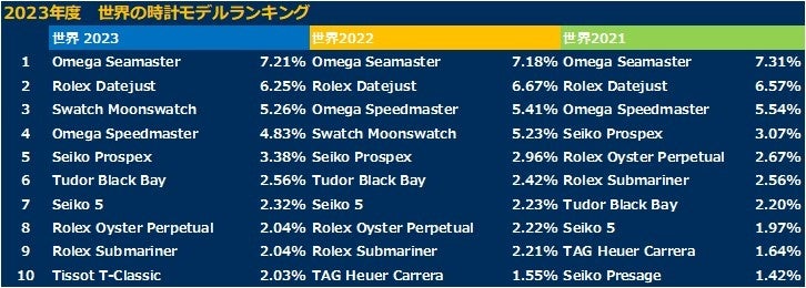 例年、上位にランクインするOmega Seamaster(シーマスター)、Rolex Datejust(デイトジャスト)に続きSwatchのMoonswatch(ムーンスウォッチ)が3位に。