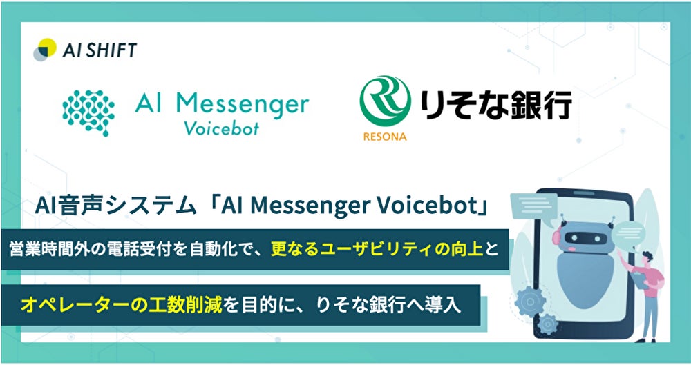 AI対話カンパニーとして対話のDXを推進する株式会社AI Shift(本社:東京都渋谷区、代表取締役社長:米山結人)は、AI自動音声対話システム「AI Messenger Voicebot」が、電話応対の業務効率改善とユーザビリティの向上に向けて、株式会社りそな銀行(本社:大阪府大阪市、代表取締役社長 :稲川 省一、以下 りそな銀行)に導入されたことをお知らせします。