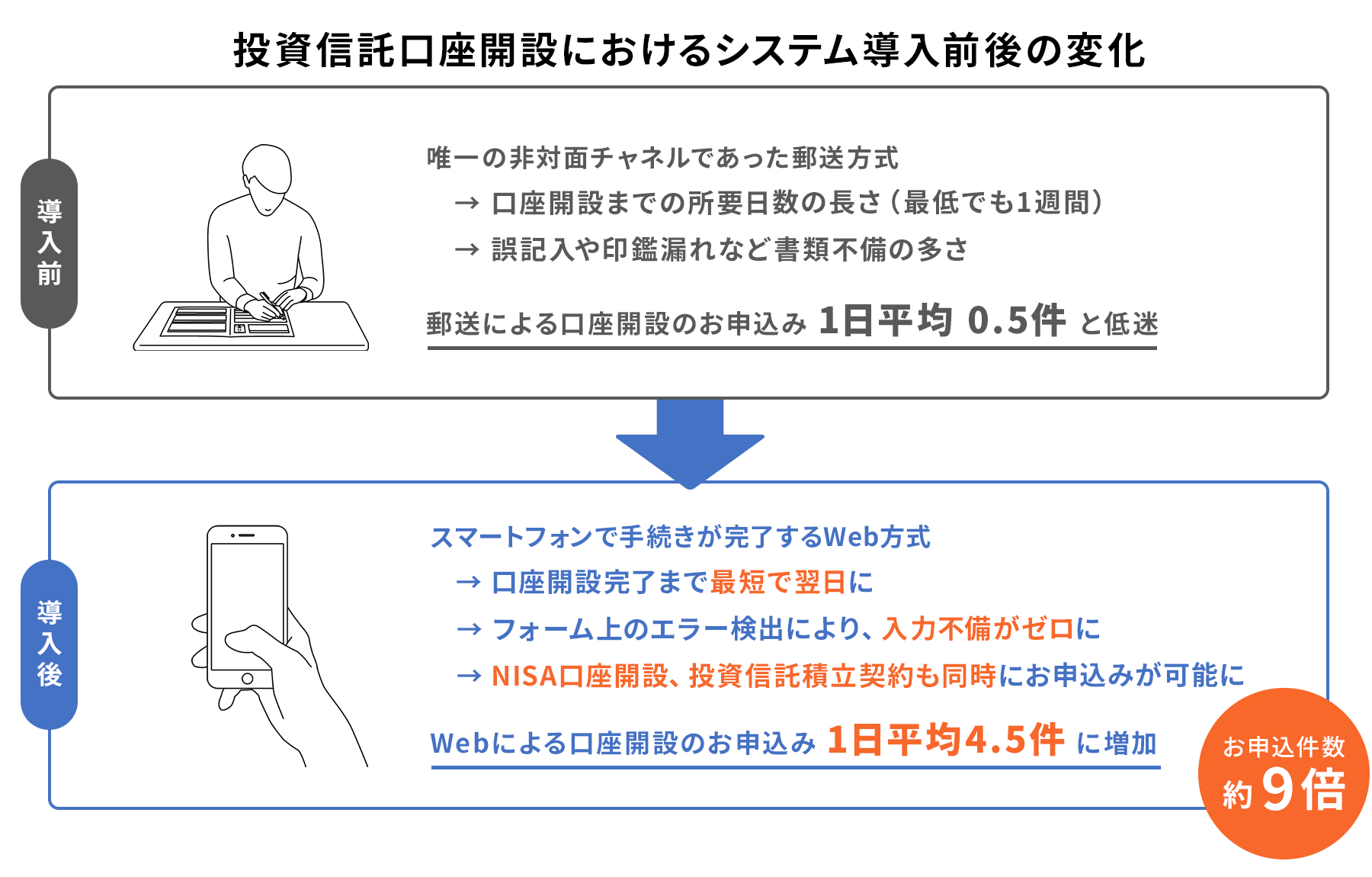 従前は、投資信託の口座開設に約1週間を要していましたが、新システムの導入により、最短で翌営業日に口座開設が可能になりました。来店が難しいお客様にとっては、いつでもどこでもお申し込みいただけるため、利便性の向上につながりました。