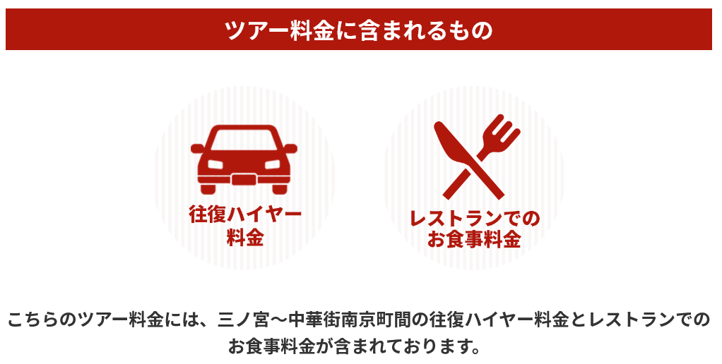 こちらのツアー料金には、三ノ宮~中華街南京町間の往復ハイヤー料金とレストランでのお食事料金が含まれております。