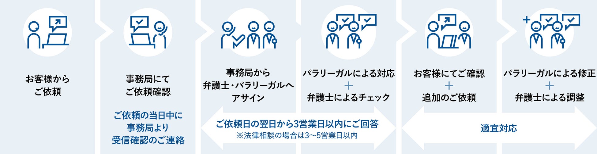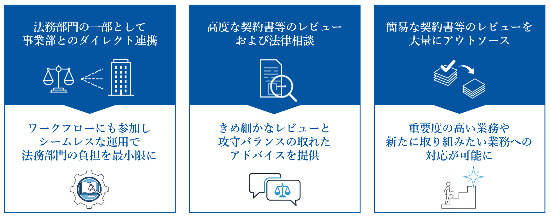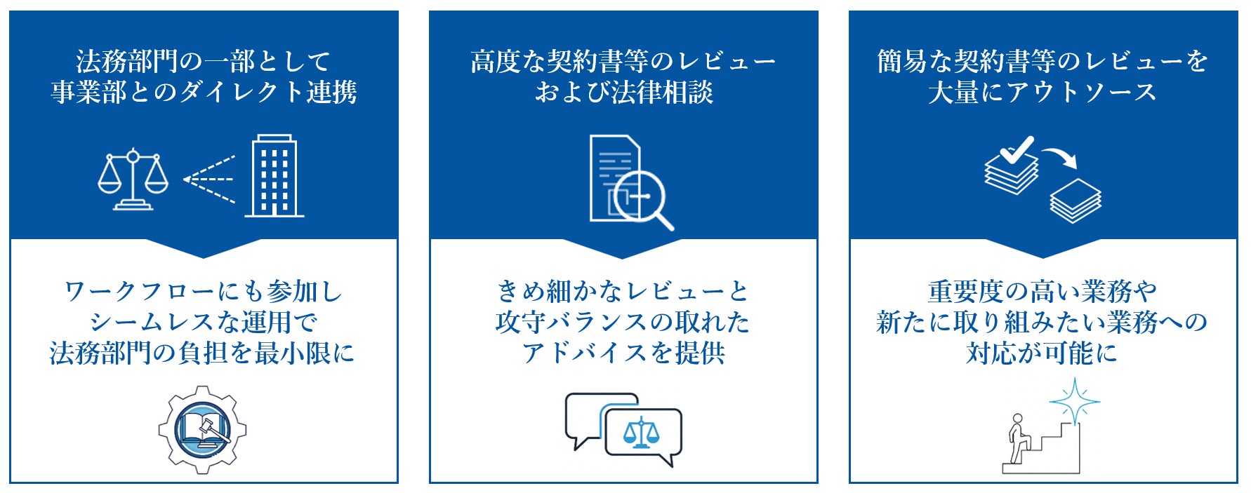 インハウス経験豊富な弁護士とパラリーガルがチームを編成。属人化を排除し、安定した高品質を提供します。