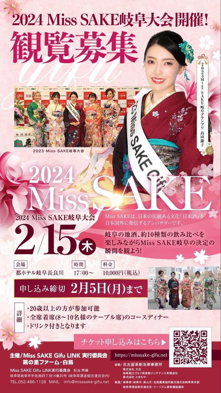 担う「2024 Miss SAKE 岐阜」を決定いたします。会場では、岐阜の地酒約10銘柄と歴代のMiss SAKE岐阜が皆様をお出迎えいたします。