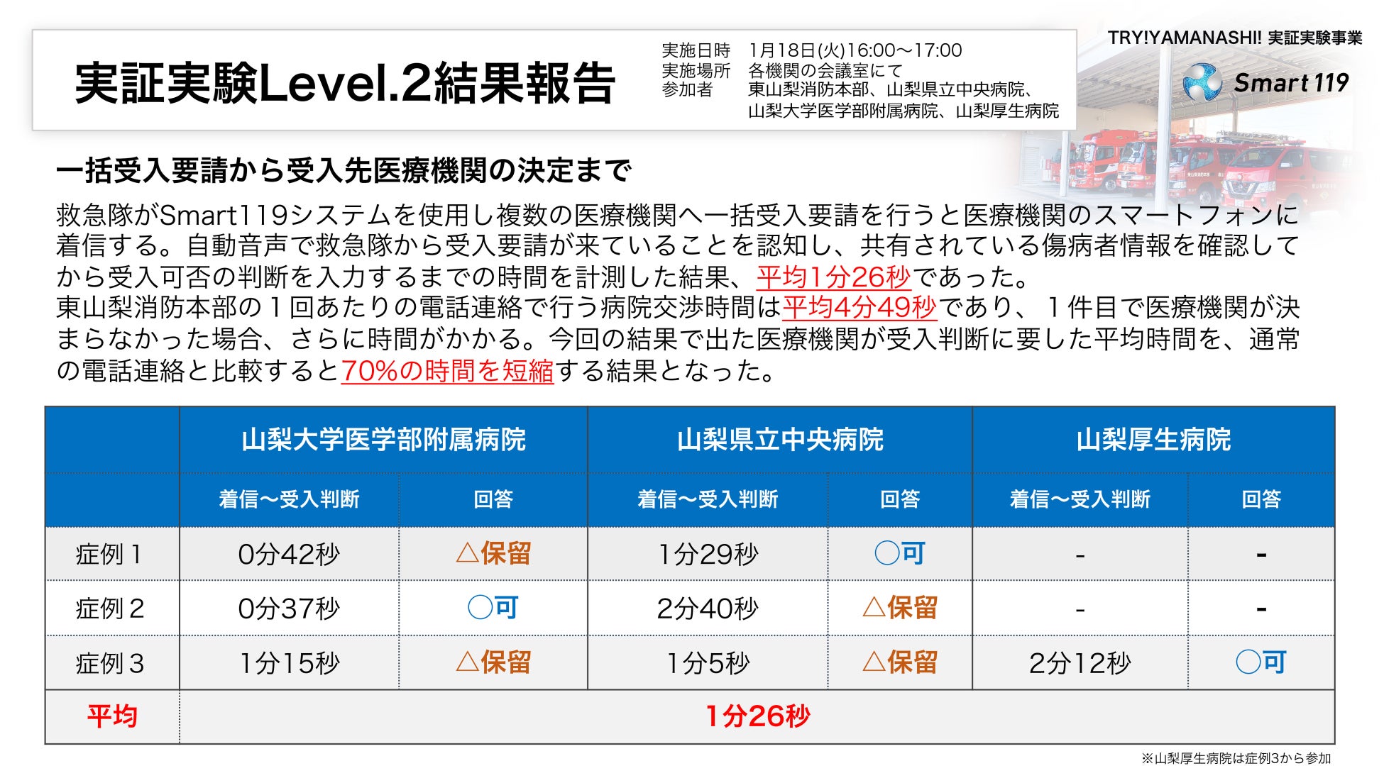 千葉大学発医療スタートアップ企業である株式会社Smart119(本社:千葉県千葉市、代表取締役社長/CEO:中田孝明)は、2021年9月に山梨県の『TRY! YAMANASHI! 実証実験サポート事業』に採択された救急医療サービス「Smart119」(特許第6875734号)の実証実験を、2022年1月18日に完了したことを発表します。